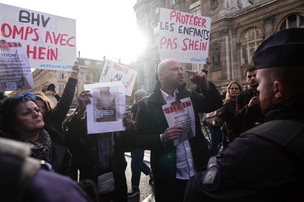 On the first day of SHEIN’s grand opening in Paris, shoppers and protestors rally at the BHV department store. The fast-fashion giant now faces controversies, boycotts and fury over labor issues, sustainability, and scandals involving its sales of “childlike” sex dolls