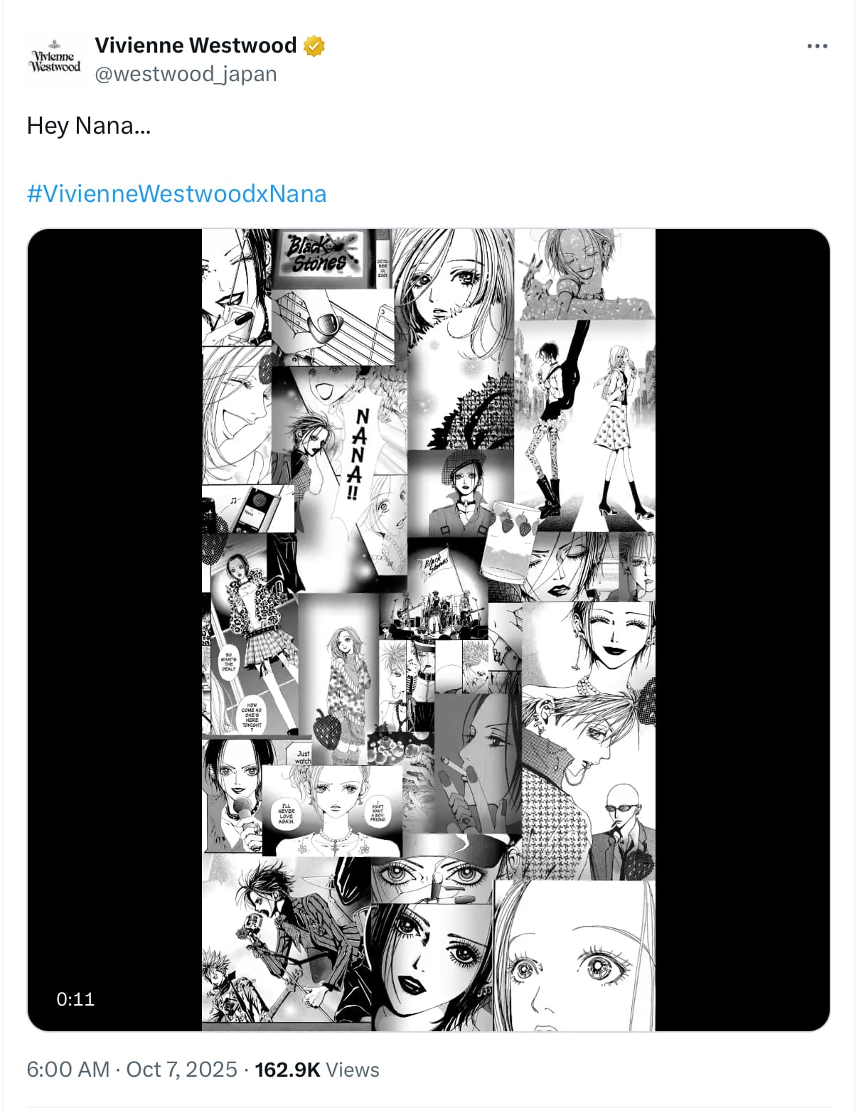 On October 7, 2025, Vivienne Westwood (@westwoof_japan) posted a short teaser on X, confirming its official partnership with NANA. The two have united as if guided by fate.